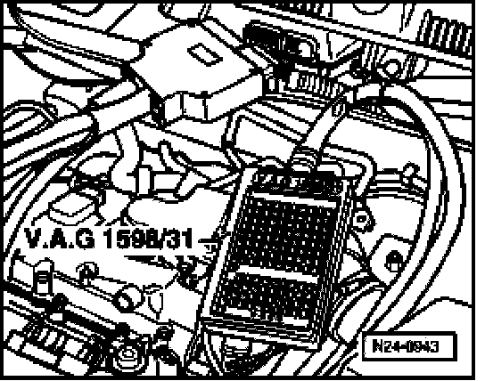 - Connect test box V.A.G 1598/31 to control module wiring harness. Engine control module remains disconnected.