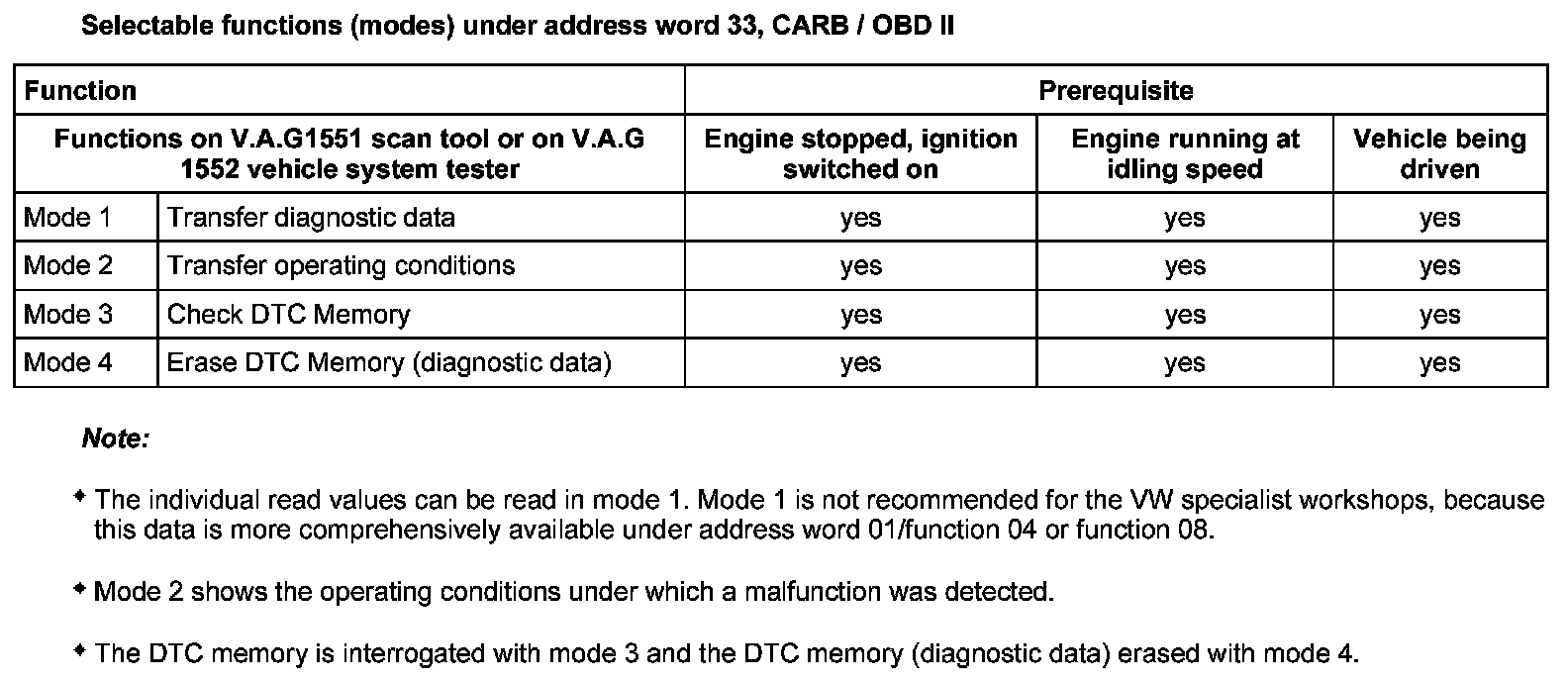 Selectable Functions (Modes) Under Address Word 33, CARB/OBDII