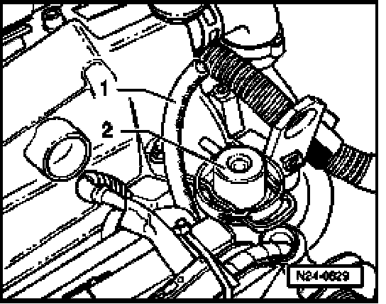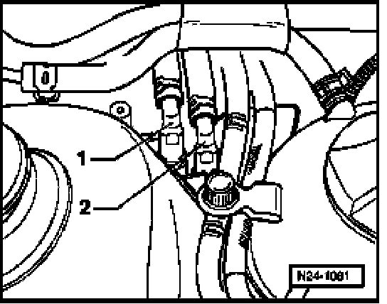- Disconnect vacuum hose -1- from fuel pressure regulator -2-. Fuel pressure should rise to about 3.0 bar positive pressure rise.