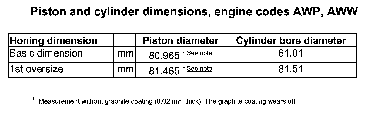 Piston and cylinder dimensions, engine codes AWP, AWW: