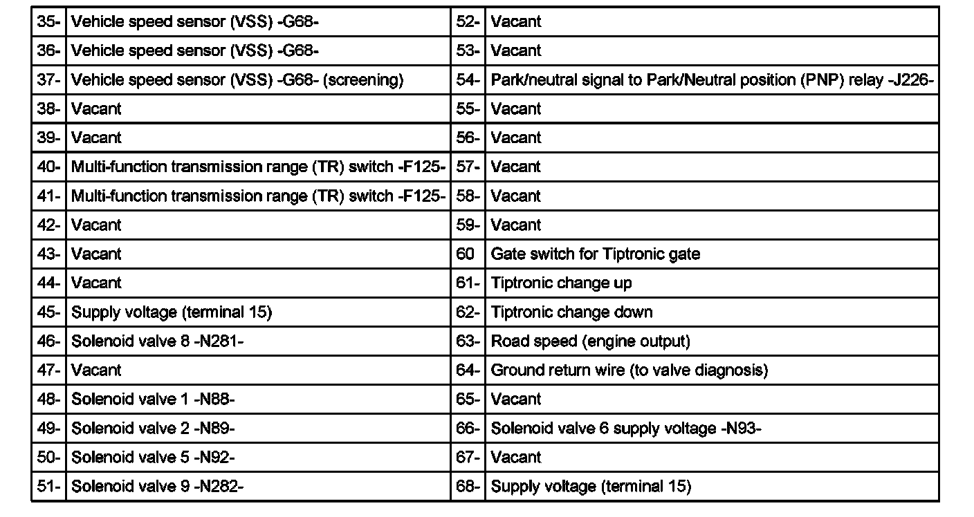 Multi-pin control module connector (68-pin connector) -J217- (sockets on VAG 1598/18), 09A, 5 Spd. A/T