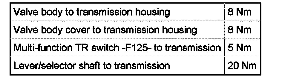 Valve body, removing and installing, 09A, 5 Spd. A/T