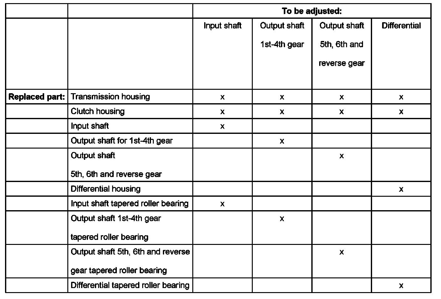 Note: If transmission repairs have been performed, it is only necessary to adjust the input shaft, output shaft for 1st-4th gear, output shaft 5th, 6th and reverse gear or differential if components have been replaced which have a direct effect on the adjustment of the transmission. Refer to the following table to avoid unnecessary adjustment.