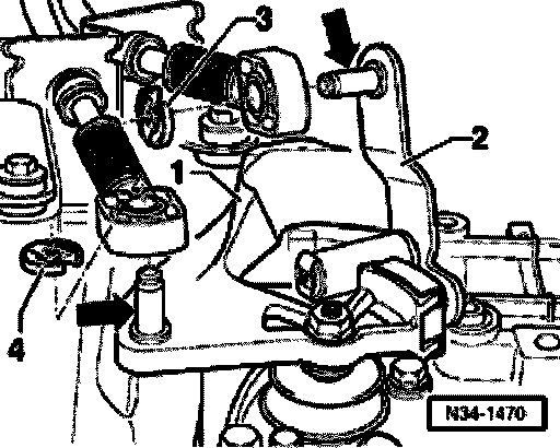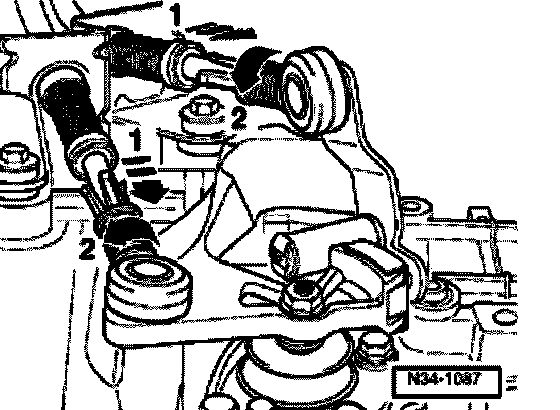 - Spread a small quantity of polyurea grease Part no. G 000 450 02 on pins (arrows) of gear shift lever -1- and relay lever -2-.