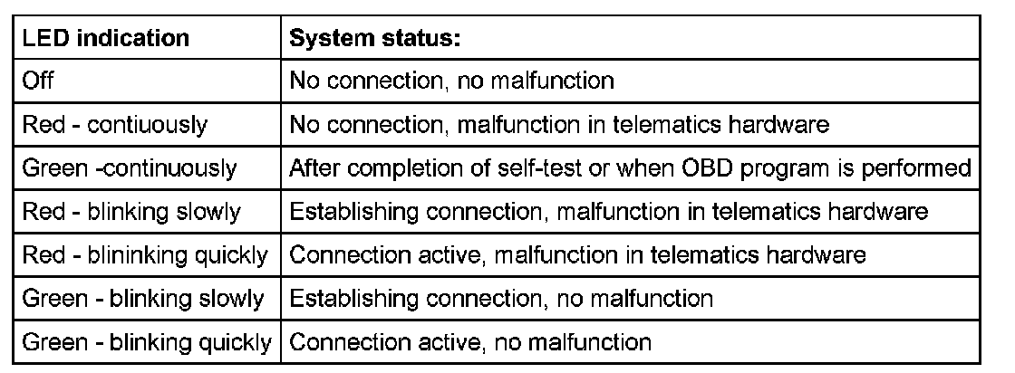 Telematic system status can be determined via the LED with the ignition switched on and referenced from the following table:
