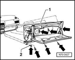 NOTE: Bolt -2- secures glove compartment - 1 - at carrier plate and is located behind center console.