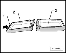 - Press in locking lug - 1 - - arrow - and open center armrest.