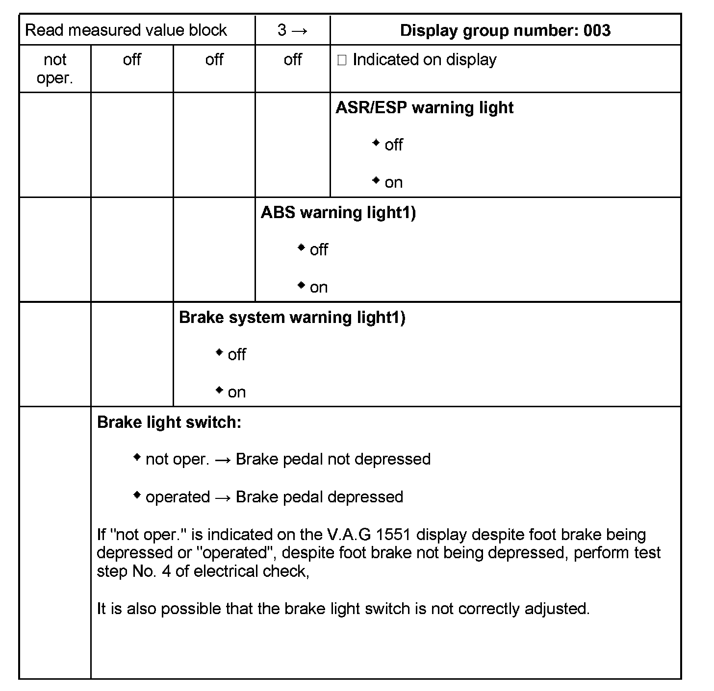 Checking brake light switch, brake system warning lamp, ABS warning lamp and ASR/ESP warning lamp