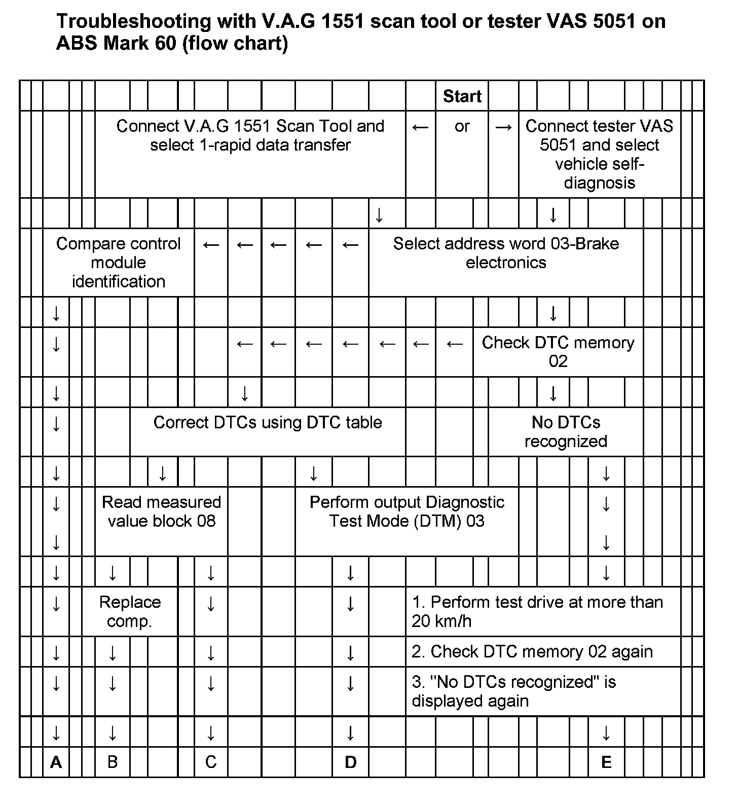 Troubleshooting with V.A.G 1551 scan tool or tester VAS 5051 on ABS Mark 60 (flow chart)Troubleshooting with V.A.G 1551 scan tool or tester VAS 5051 on ABS Mark 60 (flow chart) (Part 1):