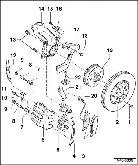 ^ Install brake pedal depressor V.A.G 1869/2 before removing a brake caliper or disconnecting a brake hose.