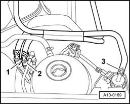 - Disconnect fuel supply line (at connection -1-. To do this slide securing ring -2- in union -3-.