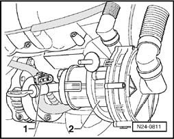 - Set camshaft pulley to TDC No. 1 cylinder by turning crankshaft 1. Mark on camshaft pulley must align with (arrow) on toothed belt guard.