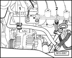 - Pull fuel supply line -1- and fuel return line -2- off connections