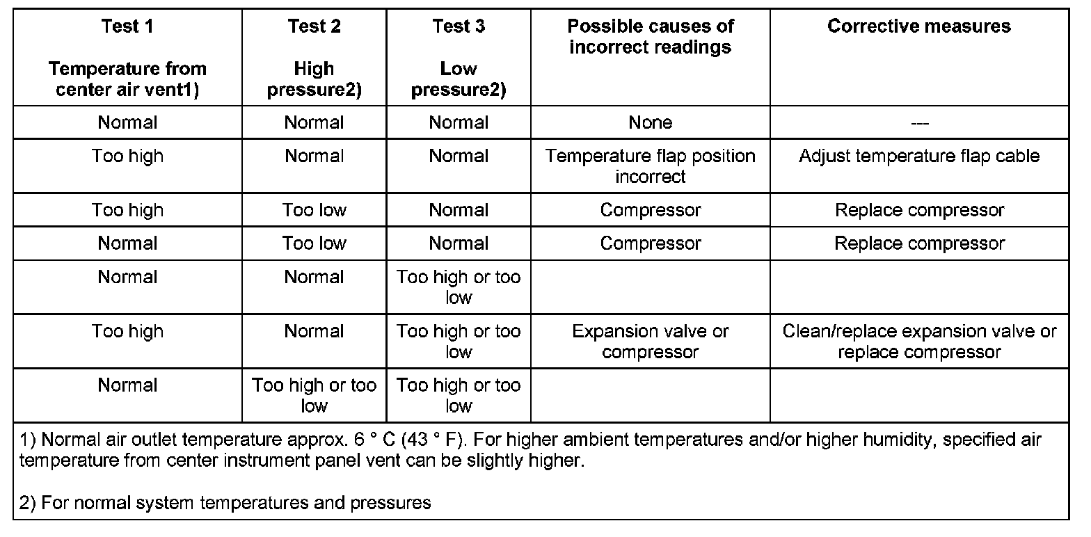 The combined results of all three steps determine which part of the A/C system is causing the problem, see table.