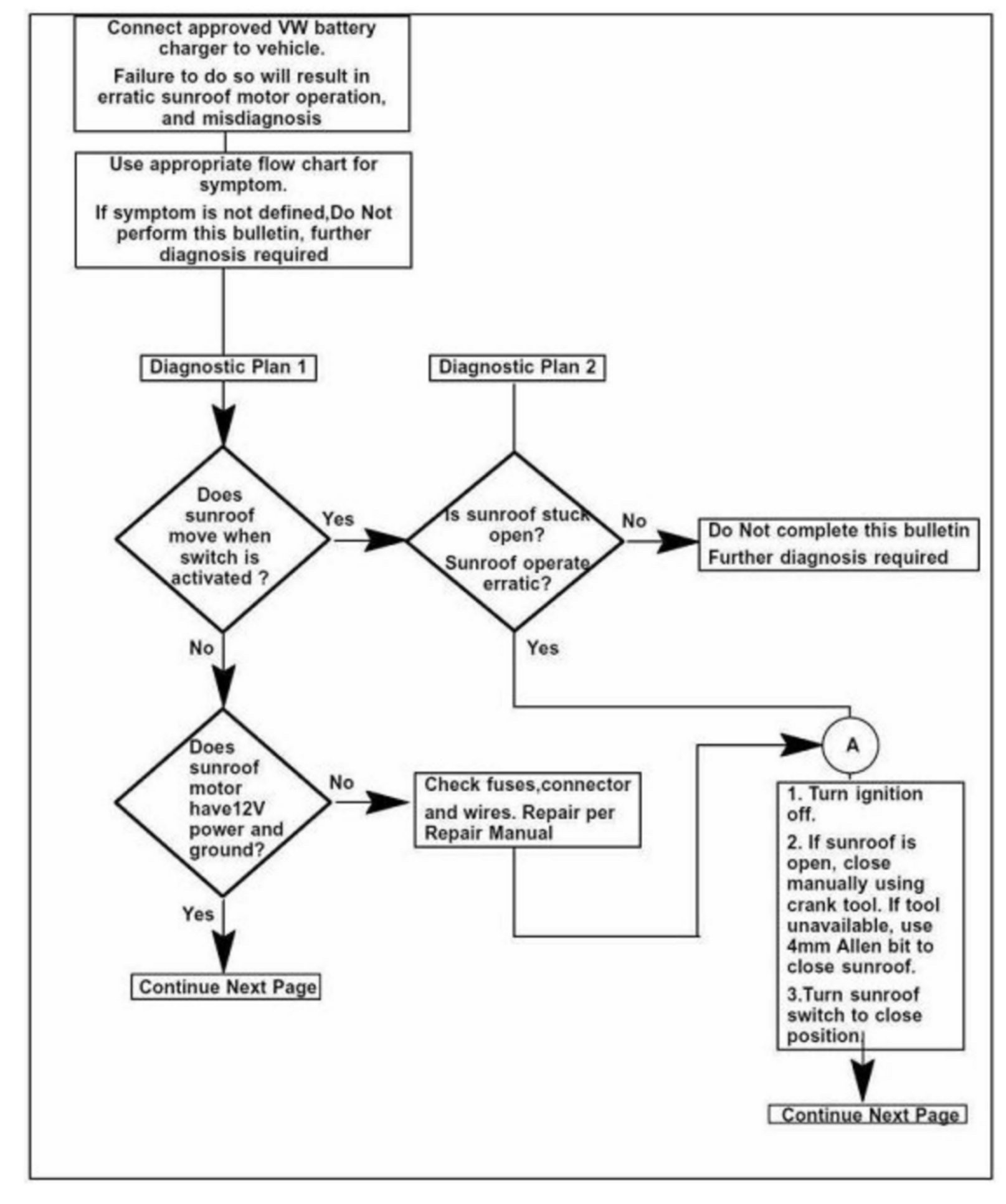 Sunroof may malfunction or fail to operate due to low battery voltage, battery being discharged, battery being disconnected, power to sunroof being interrupted while in operation, or a faulty central control module.