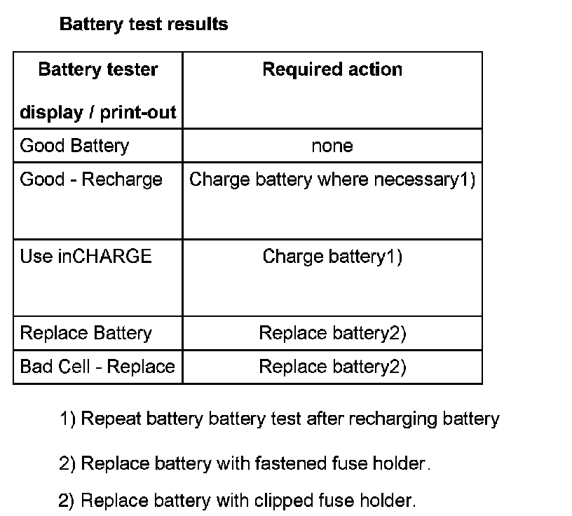 - Perform battery battery test by setting load current on tester according to battery (DIN) capacity => MCR 340 V Instruction Manual.