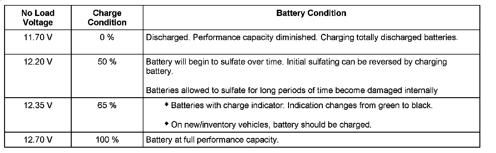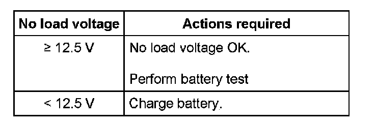 - No load voltage below 12.5 volts: Replace battery.