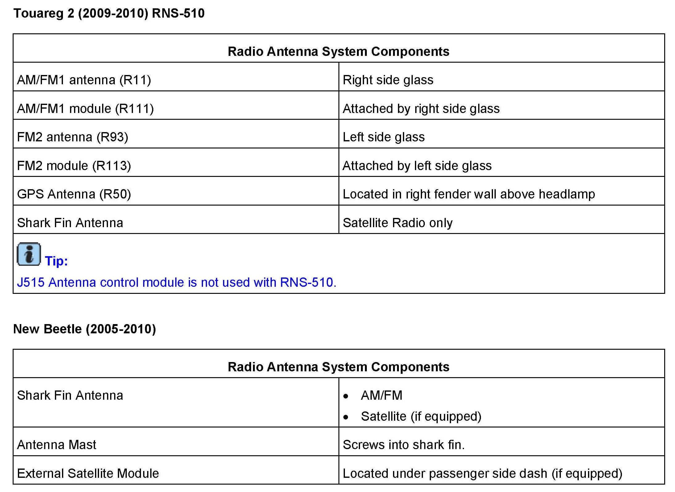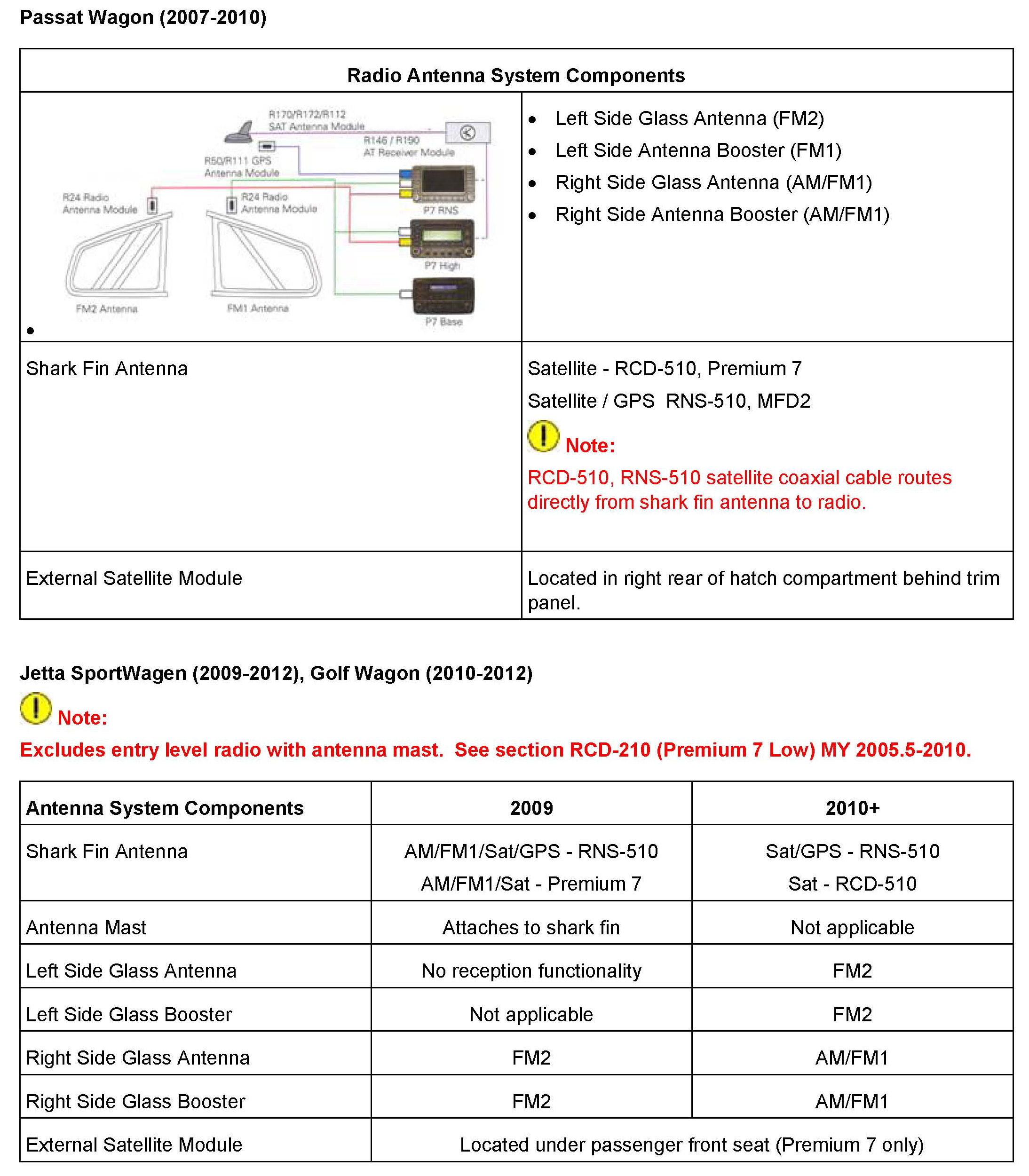^ Radios with internal satellite receiver: Is a message displayed on screen stating Satellite radio not available"? This indicates a radio concern. Swapping a known good similar radio is an easy check to confirm the radio is the problem. Applies to RNS-510, RNS-315, RCD-510, RCD-310 (with sat).