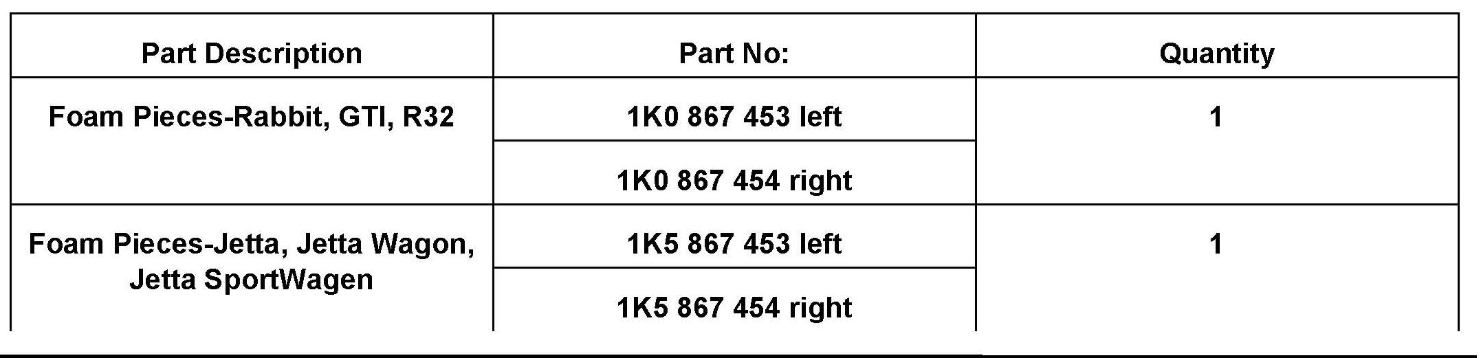 Install foam piece Part No. 1K0 867 453/454 where indicated in following procedure below: