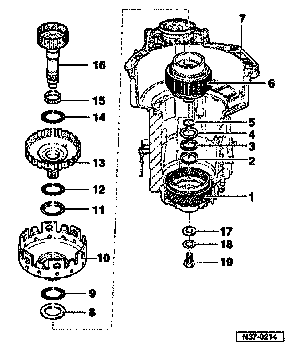 - Install all components (items -2- to -16-) to adjust planet carrier into transmission housing.