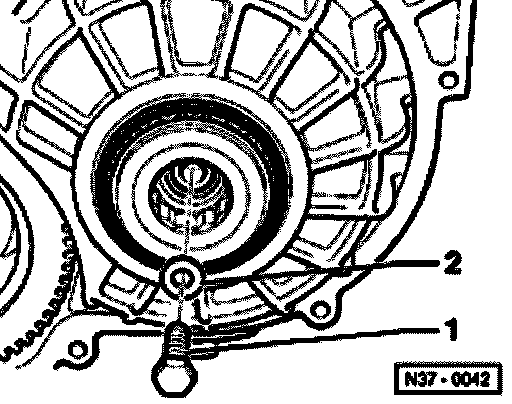 - Install small input shaft bolt -1- with washer -2- but without shim.