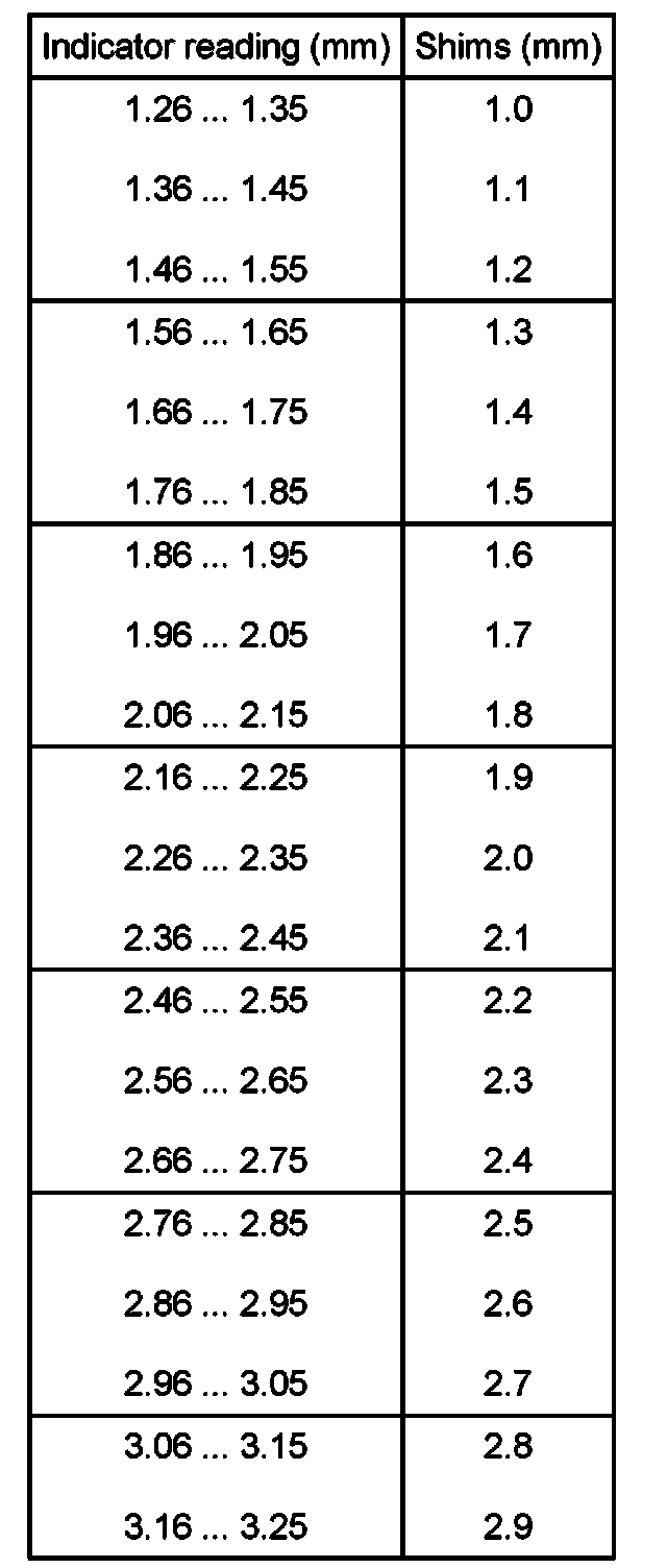 - Determine thickness of shim using table and find Part No. in parts catalog.