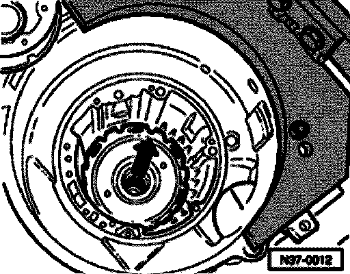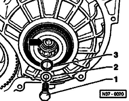 - Install small drive shaft bolt -1- with washer -2- and shim -3-, Tightening torque 30 Nm.