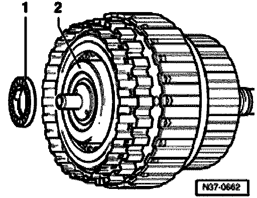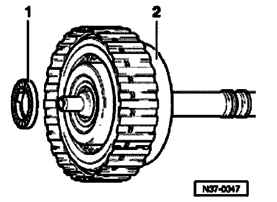 - Clip axial needle bearing -1- with washer to 3rd and 4th gear clutch -K3- -2-.