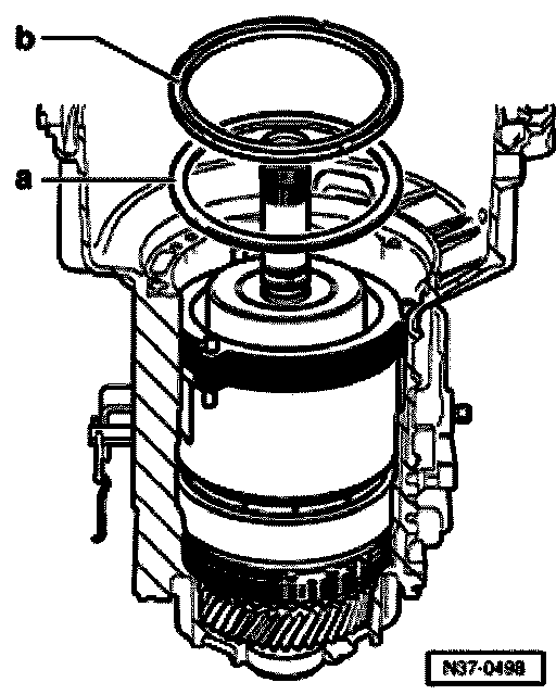 - Install circlip for freewheel -b- and circlip for supporting tube -a-.