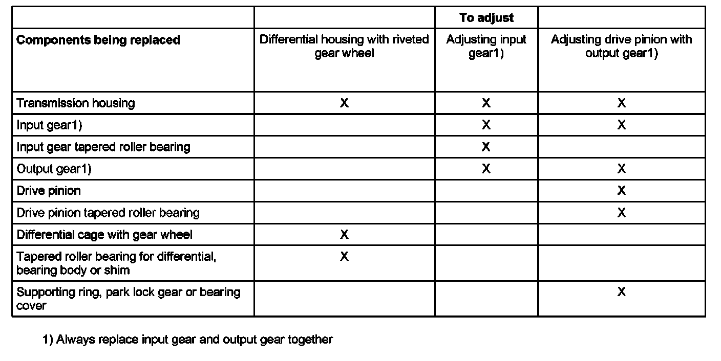 ^ When working on the transmission the following components only require adjustment if individual components have been replaced that directly affect the final drive adjustment. To eliminate unnecessary adjustments observe following: