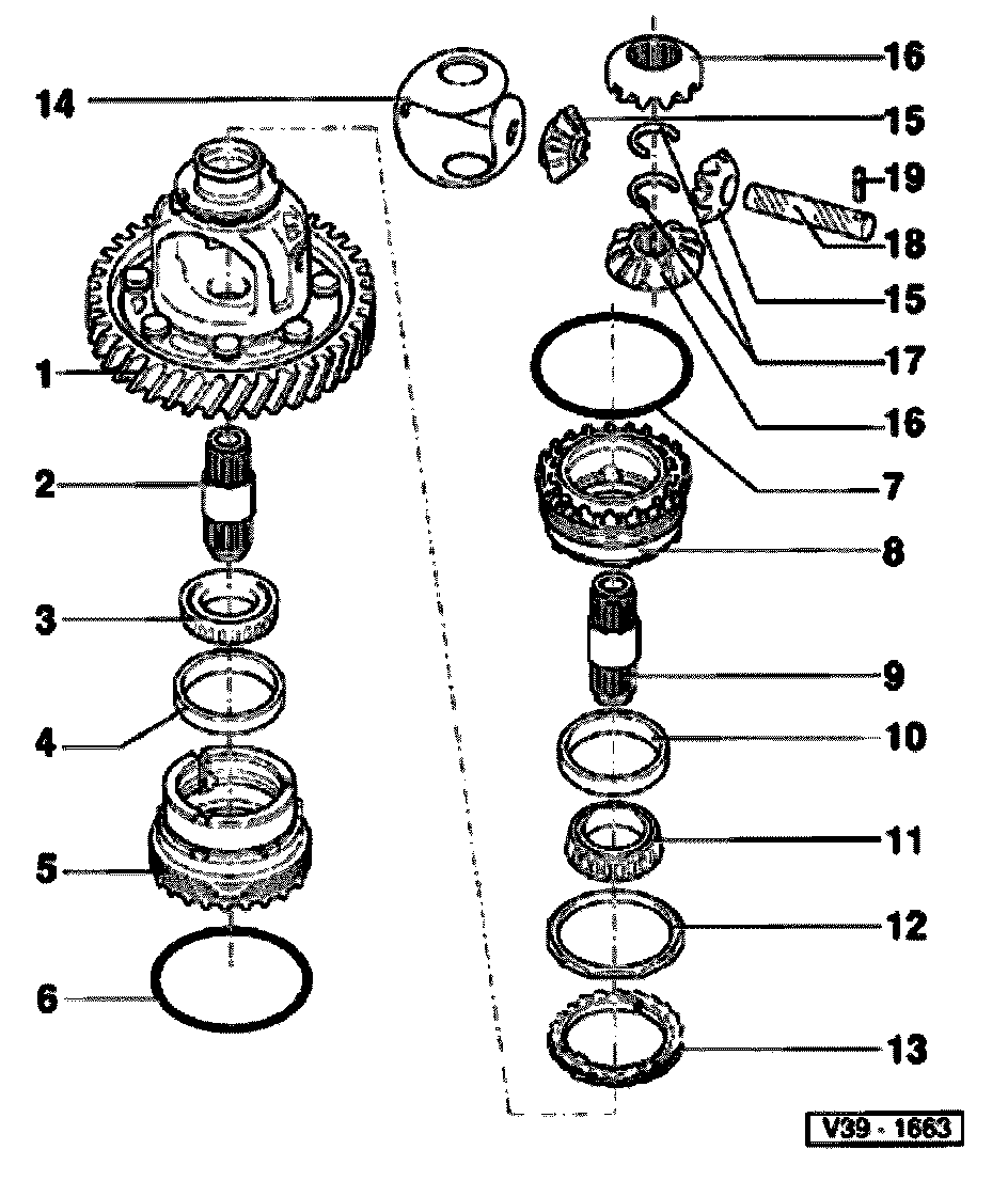 Differential, disassembling and assembling, 01M, 4 Spd. A/T