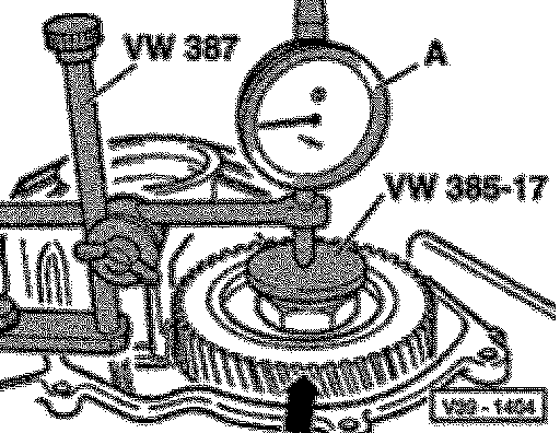 - Insert dial indicator gauge -A- and zero with a preload of 1 mm. Move drive pinion up and down. Read play at gauge and note (example 0.93 mm).