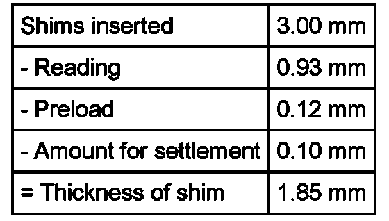 The specified bearing preload is achieved if the reading (0.93 mm), the preload of the bearings 0.12 mm and the amount for compression 0.10 mm are subtracted from the 2 x 1.5 mm thick shims.