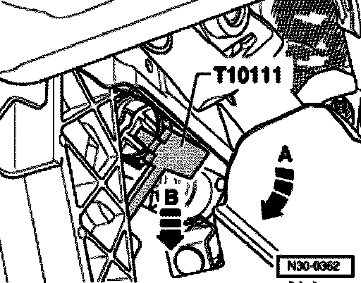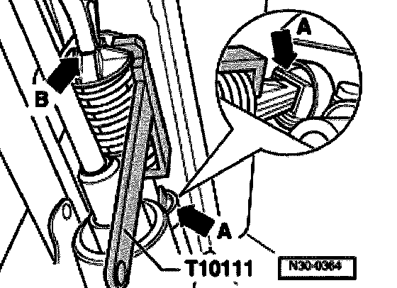 - Insert over-center spring with assembly clamp T10111 upward (in direction of arrow -A-) into bearing bracket and then turn in direction of arrow -B-.