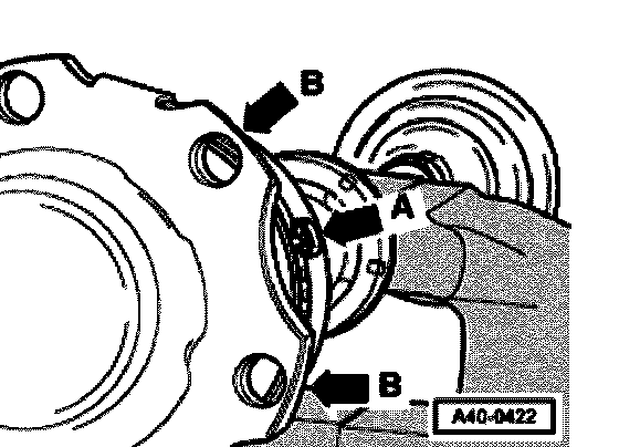 ^ For a better alignment of the multi-point socket head bolts when mounting the axle shaft, it is necessary that the clamping ear of the clamp - arrow A - is placed between the fixing flanges from the joint - arrow B -.