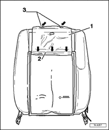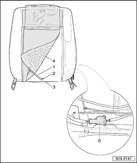 NOTE: When installing material - 1 - of heater element, it must be connected with backrest cover and backrest frame - 2 - in groove (depression) utilizing two sided tape. heater element must be installed over head rest adjuster guide holes - 3 - and secured with head rest guide.