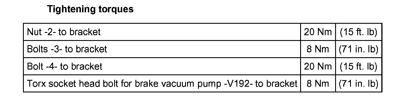 - Remove bolts -1- on bracket for brake system vacuum pump -V192-.