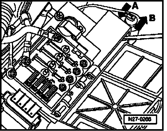 - Relieve tension on fuse holder mounting in direction of -arrow A- and release clip with screwdriver in direction of -arrow B-.