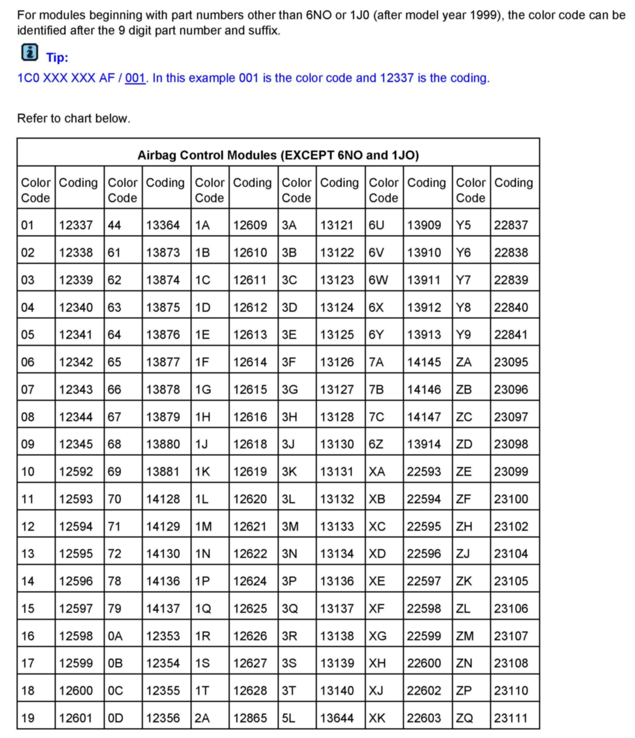 Module, Airbag, Color Code Identification and Coding