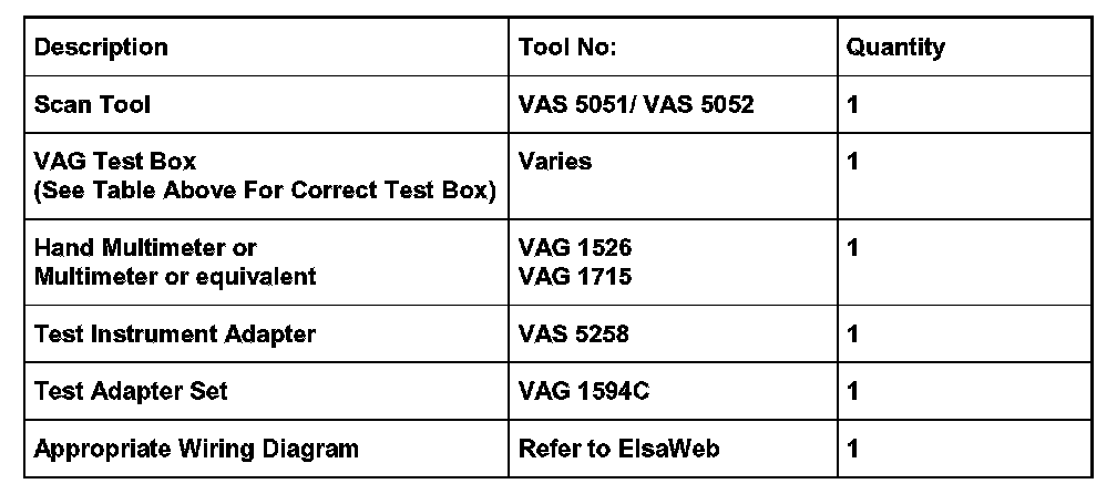 ^ Connect correct VAG 1598 test box, (as indicated in above table). See Service, to control module wiring harness. Engine control module is not connected by this action.