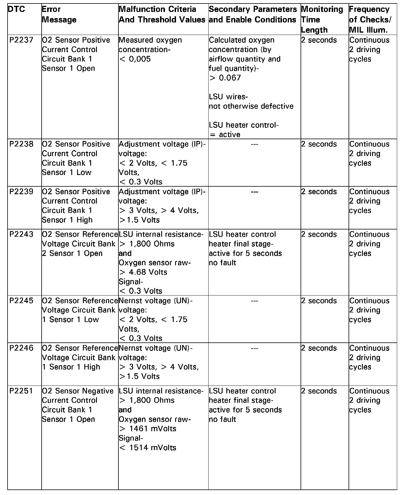 DTC P2237 - P2251: