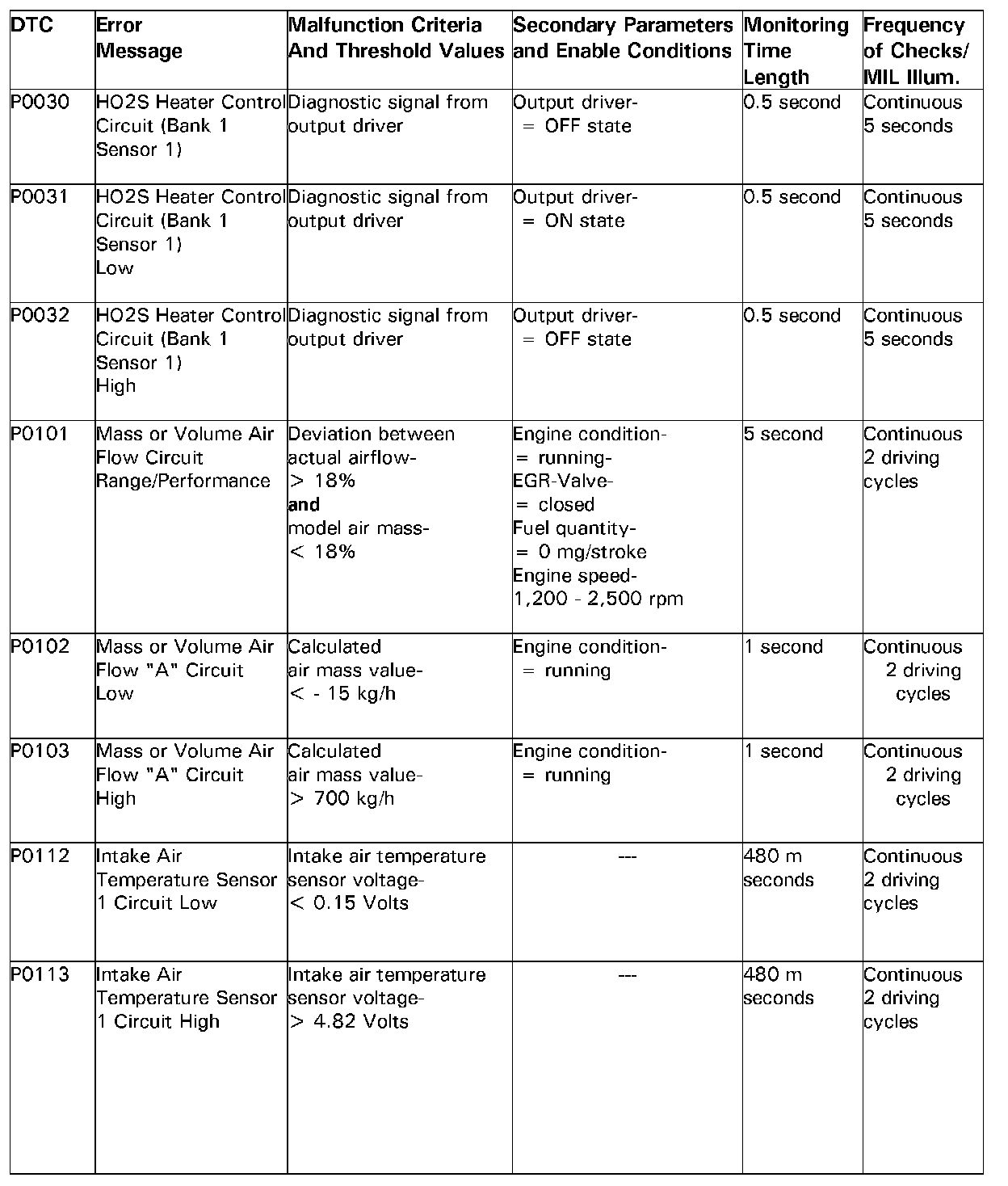 .02.00.00 OBD DTC SUMMARY TABLEDTC P0030 - P0113: