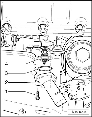 - Unscrew the bolts - 1 - from the thermostat housing - 2 - and remove the housing - 2 - with the coolant thermostat - 4 -.