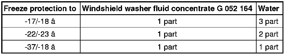 • All vehicles with fan type spray jets must be filled with windshield washer fluid concentrate (G 052 164) as this fluid has a low viscosity at minus temperatures. The complicated spray jet system could otherwise become blocked due to crystallized washer fluid that can affect the fan pattern of the spray jet. Windshield washer fluid concentrate (G 052 164) assures that the fan type spray nozzles remain functional even at low temperatures.