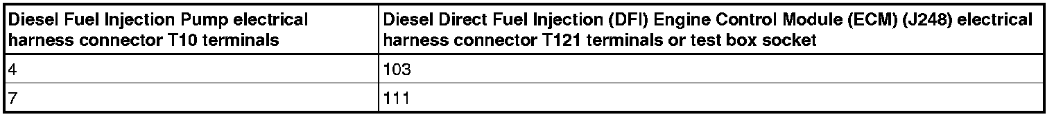- Using a Multimeter, check the Diesel Fuel Injection Pump electrical harness connector terminals to the Diesel Direct Fuel Injection (DFI) Engine Control Module (ECM) (J248) electrical harness connector T121 terminals for resistance.