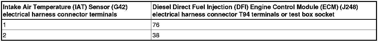 - Using a Multimeter, check the Intake Air Temperature (IAT) Sensor (G42) electrical harness connector terminals to the Diesel Direct Fuel Injection (DFI) Engine Control Module (ECM) (J248) electrical harness connector T94 terminals for resistance.