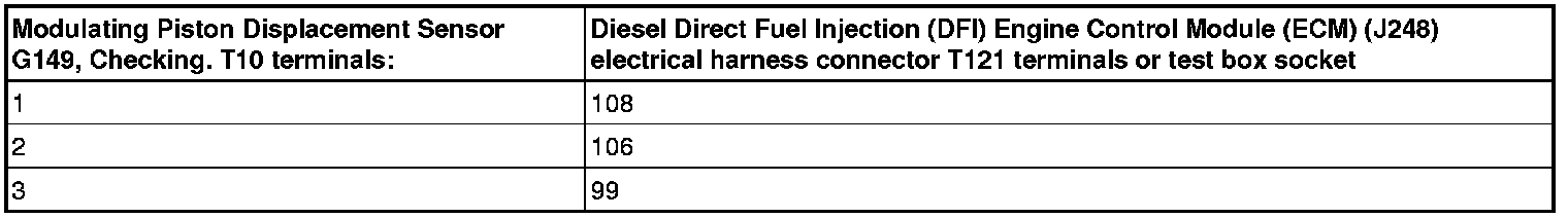 - Using a Multimeter, check the Diesel Fuel Injection Pump electrical harness connector terminals to the Diesel Direct Fuel Injection (DFI) Engine Control Module (ECM) (J248) electrical harness connector T121 terminals for resistance.