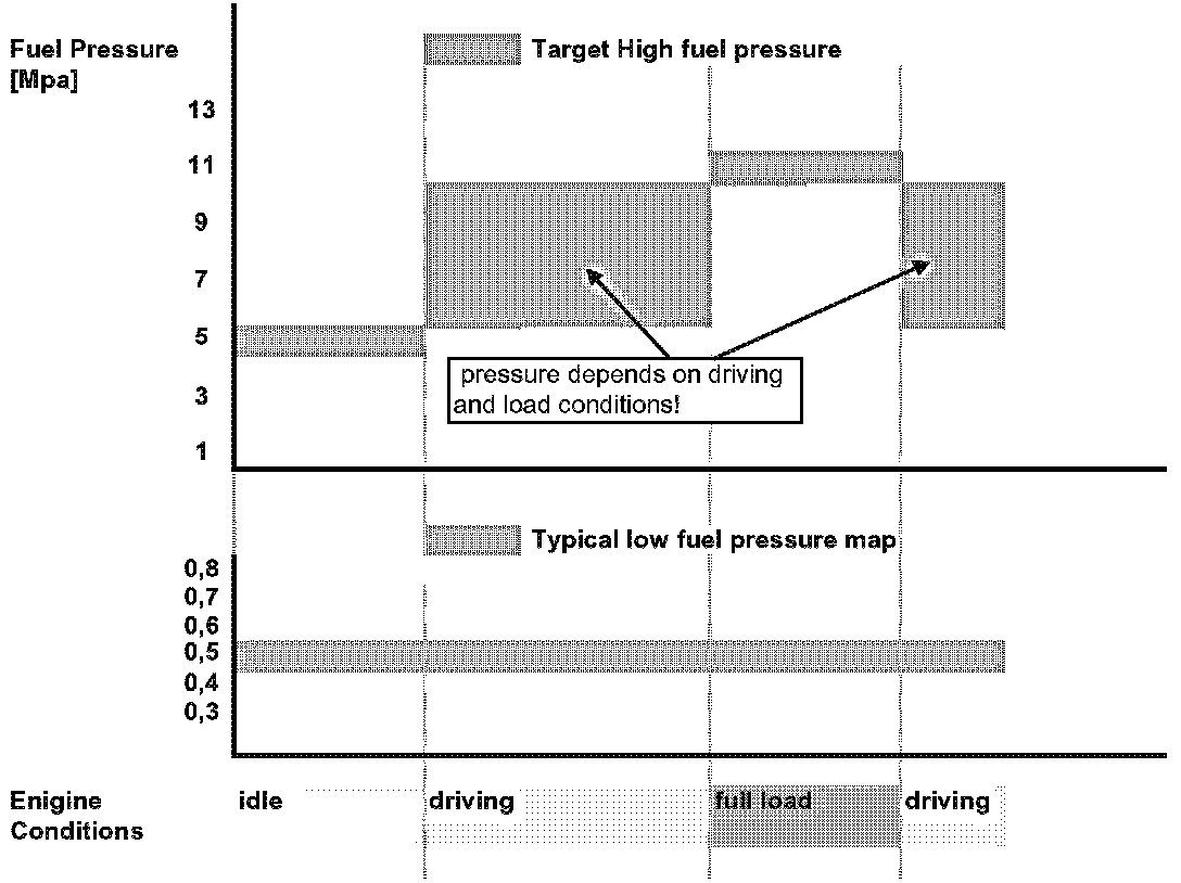 The electrical controlled, mechanical-driven high pressure fuel pump provides the injection pressure. The fuel sensors and the control valve in the high pressure system controlled the high pressure between approximately 3 and 12 MPa. The target pressure depends mainly on engine speed and torque request.