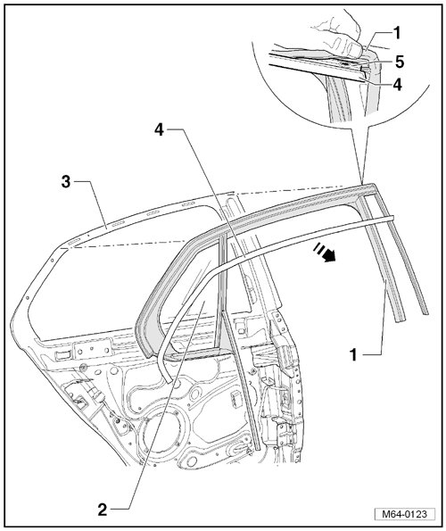 - Remove the trim molding - 4 - from the window guide - 1 - in the - direction of the arrow -.
