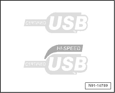 Trouble-free function is assured only when the memory sticks, MP3 players and radios authorized by Volkswagen are used. The use of memory sticks or MP3 players from other manufacturers may not be guaranteed. However, the storage medium is to have one of the two USB certificates as a minimum requirement, see diagram.